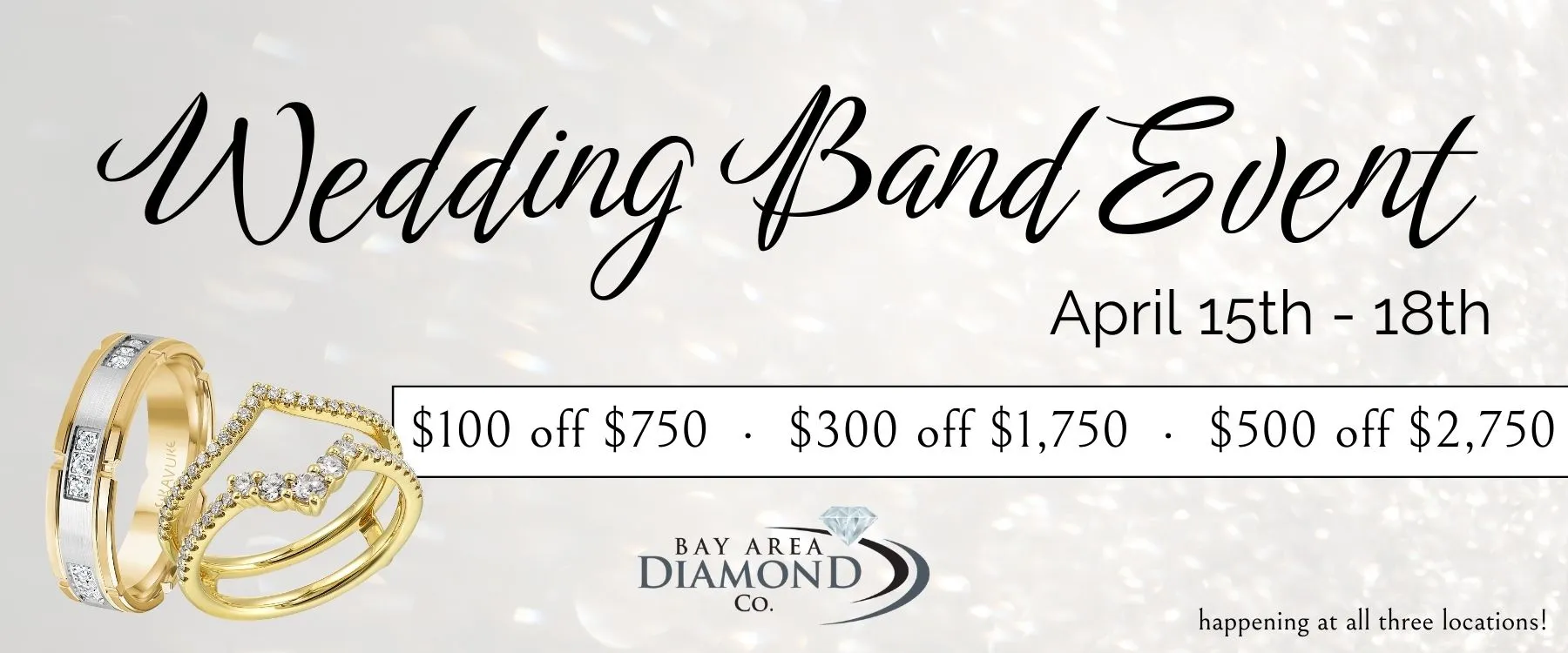 Bay Area Diamond Company’s annual Wedding Band Event is happening Wednesday, April 15th through Saturday, April 18th. We’ll have the largest selection of ladies' and men's bands that we have all year long, and we’re offering our best deal that we offer all year, too!